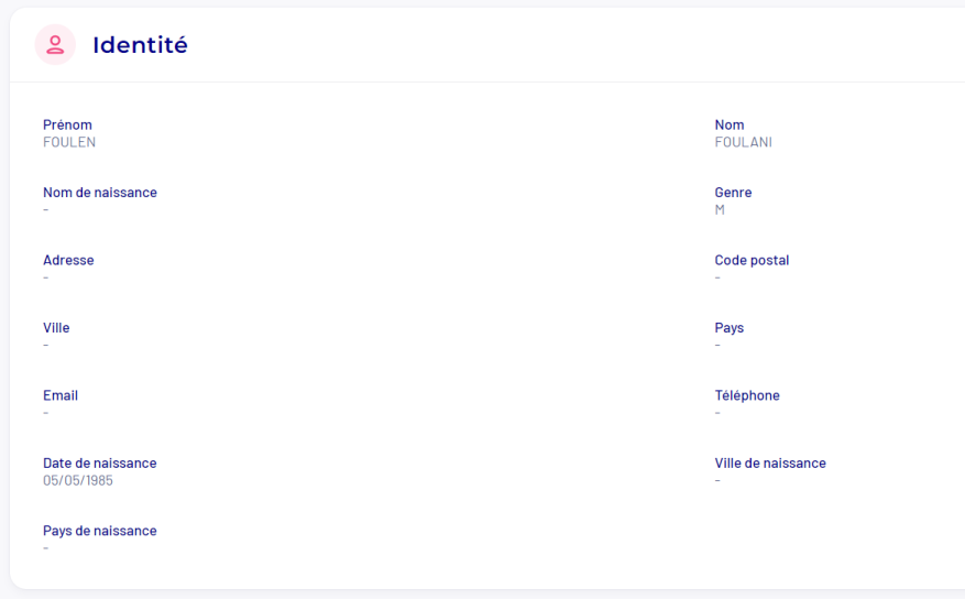 The Identity block gives you at a glance access to the personal identity information retrieved through identification (ID card or via a MIE provider):