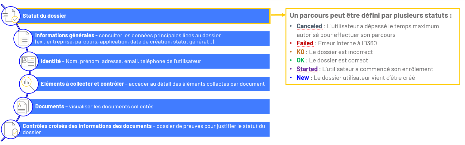 Chaque utilisation d’un parcours est défini par un dossier utilisateur. Vous avez accès à tous les dossiers en cours, quelles que soient les modalités choisies par les utilisateurs. Pour chaque parcours effectué, en cliquant sur « Voir le détail » vous aurez accès à différentes informations telles que :