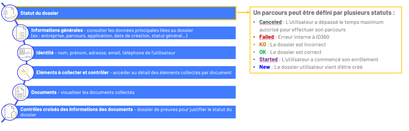 Chaque utilisation d’un parcours est défini par un dossier utilisateur. Vous avez accès à tous les dossiers en cours, quelles que soient les modalités choisies par les utilisateurs. Pour chaque parcours effectué, en cliquant sur « Voir le détail » vous aurez accès à différentes informations telles que :