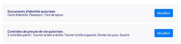 Dans cette section, vous aurez la possibilité de sélectionner les types de documents d'identité autorisés dans votre parcours, ainsi que les différents défis que les utilisateurs devront relever pour effectuer le contrôle de la preuve de vie.