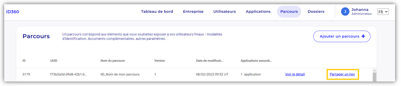 Pour tester un parcours, commencez par cliquer sur le bouton « Partager un lien » :